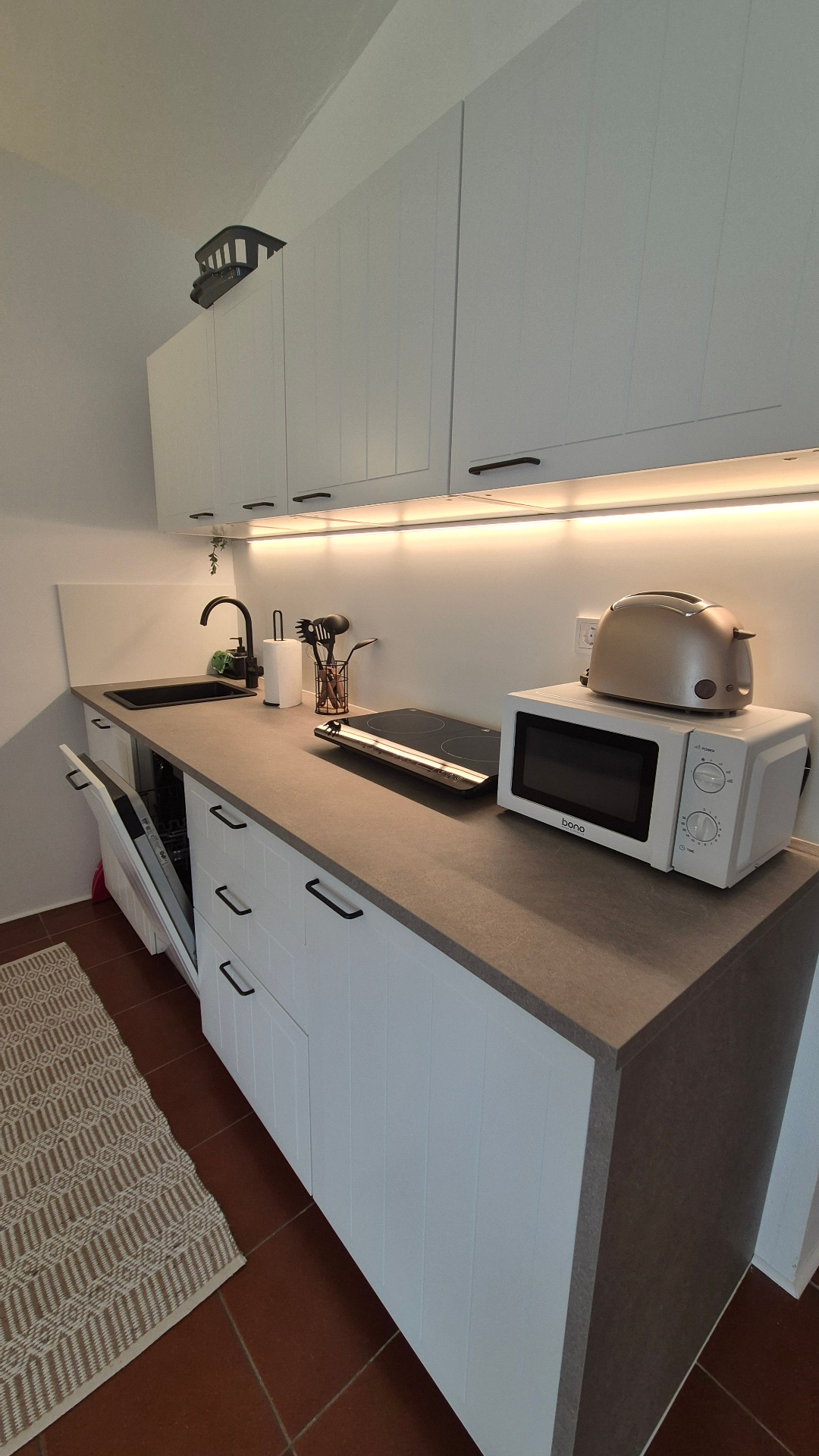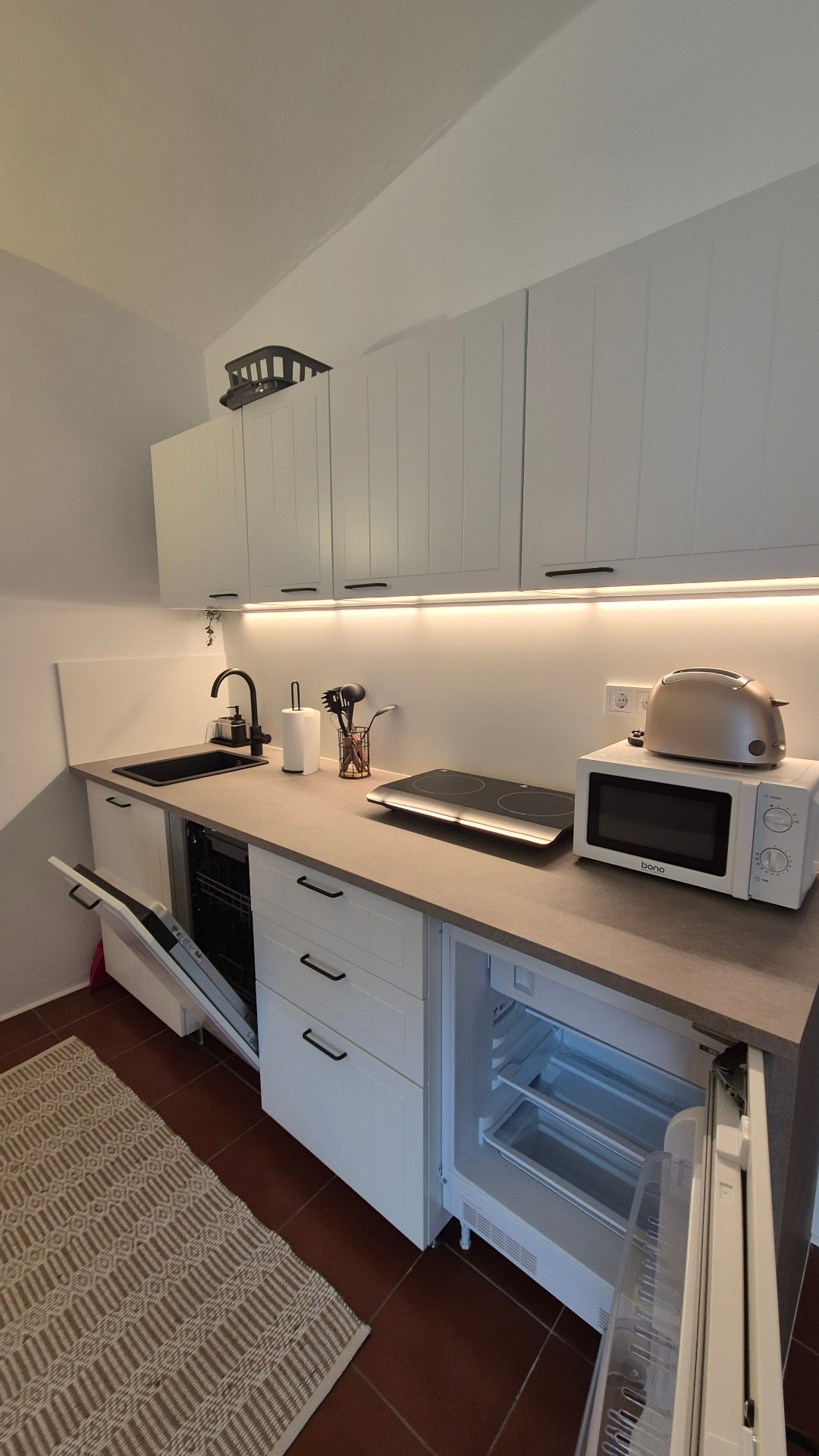 - s lednicí s mrazákem, myčkou nádobí, mikrovlnnou troubou, indukční varnou deskou, filtračním kávovarem, varnou konvicí a toustovačem.